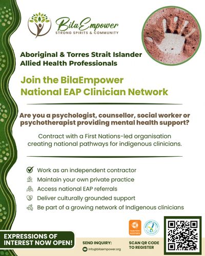BilaEmpower is a First Nations-led Public Benevolent Institution delivering culturally grounded Employee Assistance Program services across Australia. Our work brings together cultural integrity, strong clinical practice, and economic empowerment for First Nations professionals.